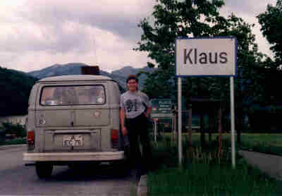 Klaus in Vorarlberg. Ja, den Ort gibts wirklich :-), in Österreich ziemlich an der Grenze zur Schweiz. Das Foto war mir den Abstecher wert. Das war kurz nach der Ausbildung, 1996 glaub ich. Der alte VW-Bus war damals Kult. Den hab ich sogar noch 2x durch den TÜV gebracht, hatte ihn also insgesamt fast 4 Jahre. Mit Sitzbank hinten zum umklappen, ein treuer Begleiter auf jeder Party ;-).